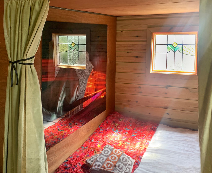 The Globe is an American style cabin that can sleep up to four people and is fitted out with a kitchenette and wet room. To its right, it has a lean too with a firepit and an outside seating area.